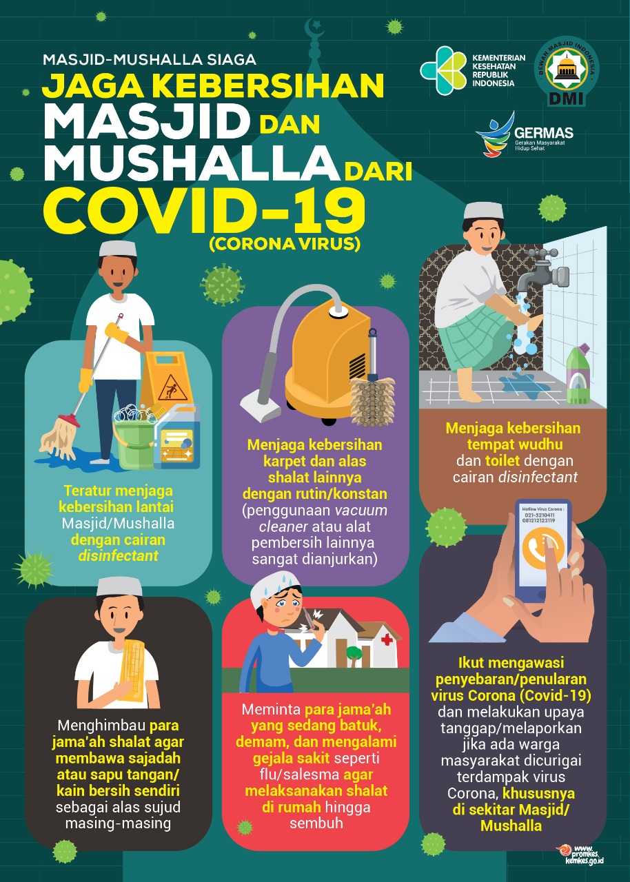 Pandemi corona COVID19 sangat meresahkan segala lapisan masyarakat, termasuk kegiatan jamaah masjid yang mengalami perubahan bahkan penundaan. Untuk mendukung program pemerintah supaya wabah tidak semakin tersebar maka berikut ini protokol covid19 skala Masjid :