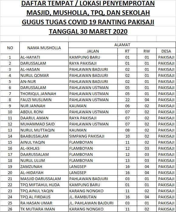 [Pakisaji, Senin, 30 Maret 2020] Para Relawan dari Remaja Masjid Al-Ihsan Pakisaji yang tergabung dalam gugus tugas Penanggulangan COVID19 NU Ranting pakisaji. mengadakan penyemprotan di Masjid, Musholla, TPQ/Madin. Dimulai dari pukul 20.00 s.d 23.00WIB. Berikut daftar tempat yang telah dilakukan penyemprotan. Kegiatan ini akan dilakukan rutin sebagai ikhtiar mencegah penyebaran covid-19.